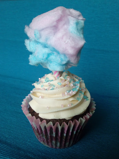 I was inspired by my time at the circus to make these cute themed cupcakes! Chocolate cakes with a mildly peanutty buttercream, topped off with a mini candy floss!